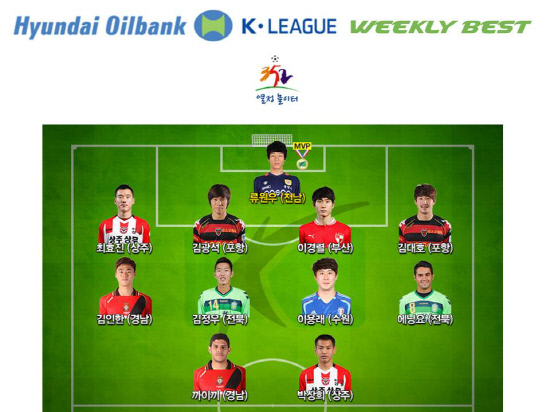 류원우는 이번 라운드 베스트11(4-4-2) 골키퍼 부문에도 뽑혔다. 투톱에는 박상희(상주)와 까이끼(경남), 베스트 미드필더에는 김인한(경남), 이용래(수원), 김정우, 에닝요(이상 전북)가 선정됐다. 김대호 김광석(이상 포항) 이경렬(부산) 최효진(상주)이 최고의 수비수로 이름을 올렸다. 베스트 수문장은 김선규(대전)였다. 16라운드 최고의 팀은 상주(총점 11.2)가 차지했고, 최고의 경기는 경남-울산전이었다.