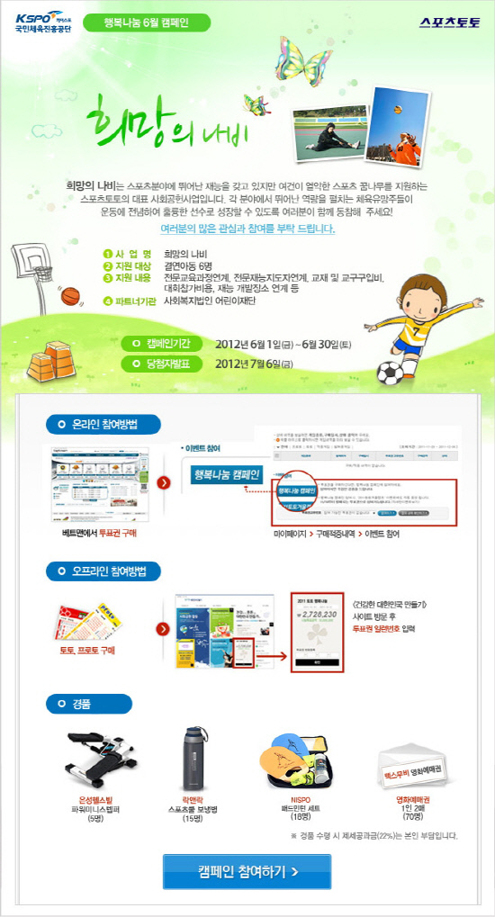 행복나눔 캠페인은 토토, 프로토를 온오프라인에서 구매 후 스포츠토토 홈페이지나 베트맨(www.betman.co.kr) 웹사이트에서 투표권의 일련번호를 등록하는 방식으로 참여할 수 있다. 각 투표권 당 30원의 행복기부금이 적립되며 참가자들 중 추첨을 통해 파워미니스텝퍼(5명), 스포츠쿨 보냉병(15명), 패드민턴 세트(18명), 영화예매권(1인 2매·70명) 등의 푸짐한 경품을 증정한다.