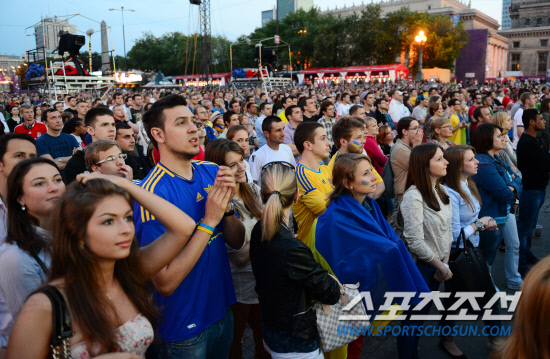 개최국 우크라이나가 유로 2012 8강 진출에 실패했다. 20일(한국시각) 우크라이나 돈바스 아레나에서 열린 D조 예선 마지막 경기에서 우크라이나는 잉글랜드에 0-1로 패하며 조 4위로 8강 진출이 좌절됐다. 같은 시각 폴란드 바르샤바 팬존에서는 폴란드로 유학을 온 우크라이나 학생들이 길거리 응원을 했다. 경기가 종반을 향해 치닫자 안타까워하고 있는 사람들의 모습.