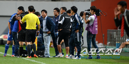 윤성효 수원 감독이 20일 FC서울과의 FA컵 16강전에서 이용래의 이마가 찢어지자 심판에게 항의를 하고 있다. 상암=허상욱 기자 wook@sportschosun.com