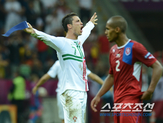 포르투갈이 호날두의 결승골로 체코를 1-0으로 물리치고 4강에 진출했다. 22일(한국시각) 폴란드 바르샤바 국립경기장에서 포르투갈과 체코의 유로 2012 8강전이 열렸다. 경기가 끝나자 호날두가 관중석을 바라보며 환호하고 있다.