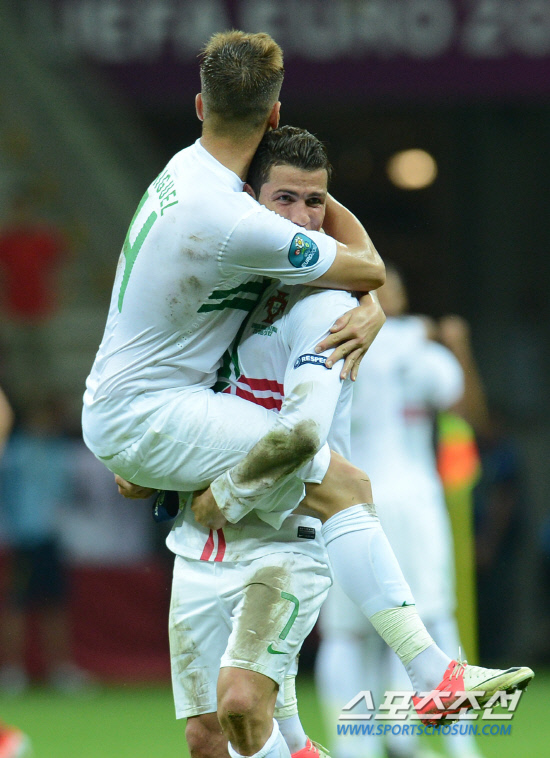 포르투갈이 호날두의 결승골로 체코를 1-0으로 물리치고 4강에 진출했다. 22일(한국시각) 폴란드 바르샤바 국립경기장에서 포르투갈과 체코의 유로 2012 8강전이 열렸다. 경기가 끝나자 호날두가 미구엘 벨로수와 포옹을 하며 기뻐하고 있다.