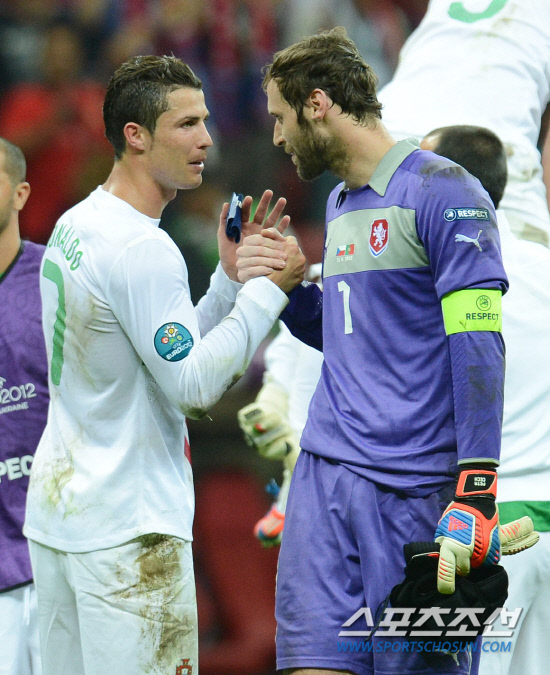 포르투갈이 호날두의 결승골로 체코를 1-0으로 물리치고 4강에 진출했다. 22일(한국시각) 폴란드 바르샤바 국립경기장에서 포르투갈과 체코의 유로 2012 8강전이 열렸다. 경기가 끝나자 체코 골키퍼 체흐가 호날두와 악수를 나누며 4강진출을 축하하고 있다.