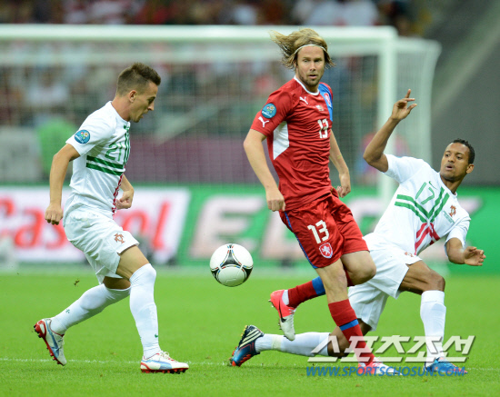 포르투갈이 호날두의 결승골로 체코를 1-0으로 물리치고 4강에 진출했다. 22일(한국시각) 폴란드 바르샤바 국립경기장에서 포르투갈과 체코의 유로 2012 8강전이 열렸다. 체코 플라실이 포르투갈 페레이라와 나니 사이에서 공을 빼앗기고 있다.