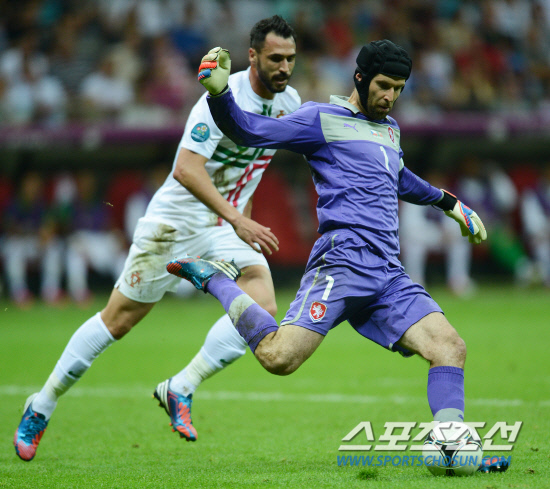 포르투갈이 호날두의 결승골로 체코를 1-0으로 물리치고 4강에 진출했다. 22일(한국시각) 폴란드 바르샤바 국립경기장에서 포르투갈과 체코의 유로 2012 8강전이 열렸다. 체코 체흐 골키퍼가 포르투갈 알메이다를 피해 공을 차고 있다.