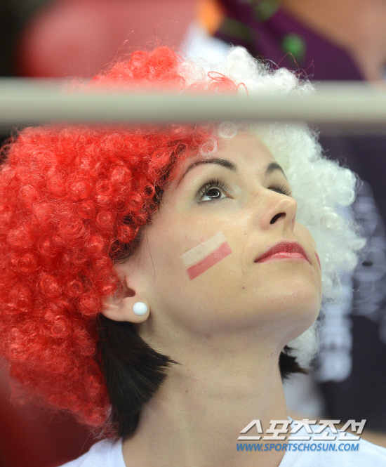 22일(한국시각) 폴란드 바르샤바 국립경기장에서 포르투갈과 체코의 유로 2012 8강전이 열렸다. 폴란드 국기색 가발을 쓴 한 폴란드 여성이 경기가 시작되길 기다리고 있다.