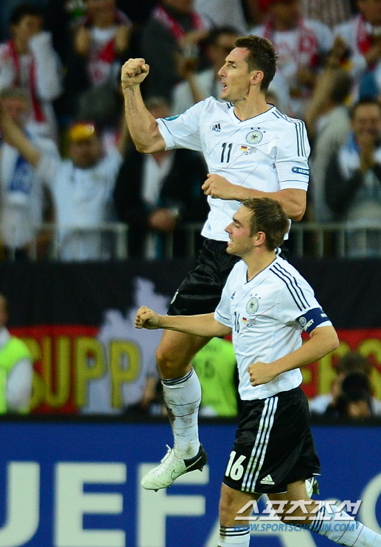 독일과 그리스가 4강을 향한 길목에서 맞붙었다. 23일(한국시각) 폴란드 그단스크 아레나에서 유로 2012 독일과 그리스의 8강전이 열렸다. 독일 클로제가 팀의 세번 째 골을 넣고 환호하고 있다.