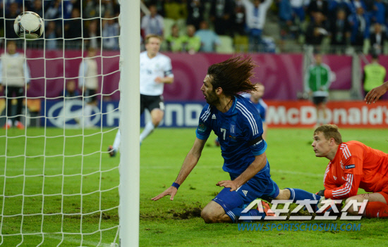 독일이 그리스를 4-2로 물리치고 4강에 진출했다. 23일(한국시각) 폴란드 그단스크 아레나에서 유로 2012 독일과 그리스의 8강전이 열렸다. 그리스 사마라스가 살핑기디스의 패스를 받아 골키퍼를 제치며 동점골을 넣고 있다.
