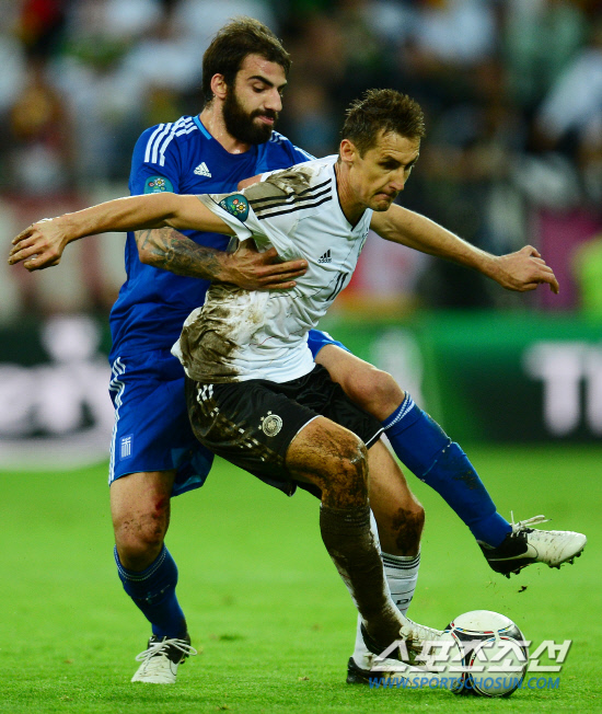 독일이 그리스를 4-2로 물리치고 4강에 진출했다. 23일(한국시각) 폴란드 그단스크 아레나에서 유로 2012 독일과 그리스의 8강전이 열렸다. 그리스 마코스가 독일 클로제를 뒤에서 밀착마크하고 있다.