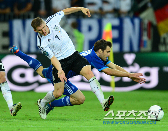독일이 그리스를 4-2로 물리치고 4강에 진출했다. 23일(한국시각) 폴란드 그단스크 아레나에서 유로 2012 독일과 그리스의 8강전이 열렸다. 그리스 파파스타토풀로스가 독일 슈바인슈타이거와 공을 다투다 넘어지고 있다.