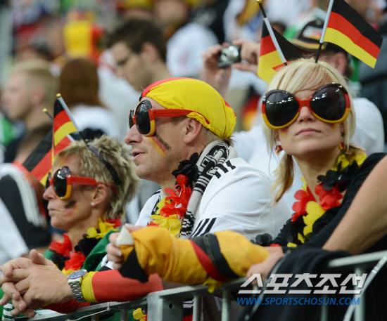 독일과 그리스가 4강을 향한 길목에서 맞붙었다. 23일(한국시각) 폴란드 그단스크 아레나에서 유로 2012 독일과 그리스의 8강전이 열렸다. 커다란 안경을 쓰고 독일을 응원하는 팬들이 경기를 기다리고 있다.