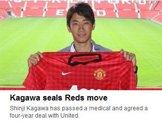 맨유는 23일(이하 한국시각) 구단 홈페이지를 통해 가가와의 맨유 이적을 최종 확정했다고 밝혔다. 가가와는 22일 맨유의 메디컬 테스트를 통과했고, 당초 난관이 있을 것이라는 워크퍼밋(노동 허가서)까지 문제없이 발급받았다. 가가와의 계약기간은 4년이다. 이로써 가가와는 맨유 유니폼을 입은 최초의 일본인 선수가 됐고, 박지성과 한솥밥을 먹게 됐다.