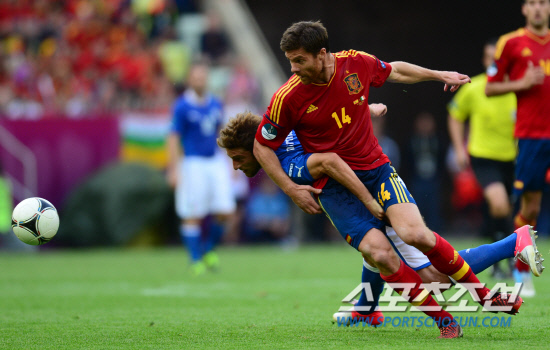 ◇사비 알론소가 프랑스와의 유로2012 8강전에서 멀티골을 터뜨리며 스페인의 2대0 완승을 이끌었다. 11일 이탈리아와의 조별리그 경기에 출전한 알론소가 이탈리아의 마르키시오와 치열한 몸싸움을 벌이고 있다. 그단스크(바르샤바)=정재근 기자 cjg@sportschosun.com