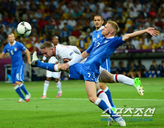이탈리아와 잉글랜드가 4강 진출을 향한 한판 승부를 벌였다. 25일(한국시각) 우크라이나 키예프 올림픽스타디움에서 유로 2012 8강전 이탈리아와 잉글랜드의 경기가 열렸다. 잉글랜드 루니가 이탈리아 아바테의 수비를 뚫고 헤딩슛을 시도하고 있다.