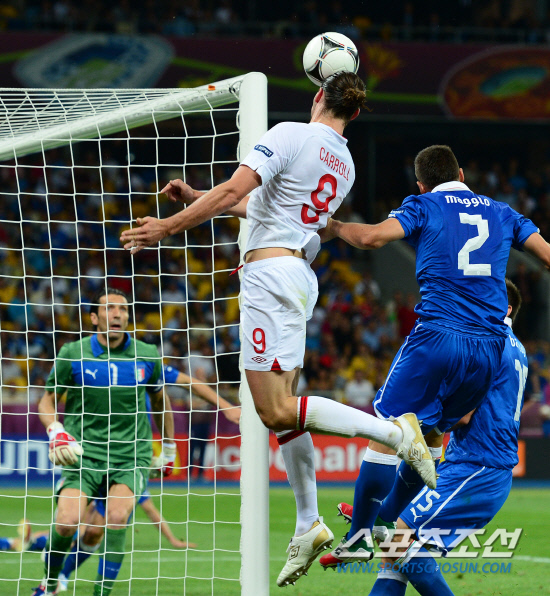 이탈리아와 잉글랜드가 4강 진출을 향한 한판 승부를 벌였다. 25일(한국시각) 우크라이나 키예프 올림픽스타디움에서 유로 2012 8강전 이탈리아와 잉글랜드의 경기가 열렸다. 잉글랜드 캐롤이 공이 아웃된 상태에서 헤딩을 하고 있다.
