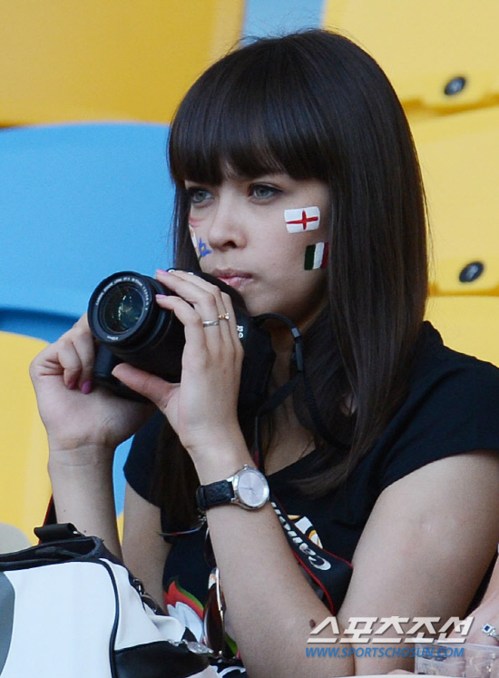 25일(한국시각) 우크라이나 키예프 올림픽스타디움에서 유로 2012 8강전 이탈리아와 잉글랜드의 경기가 열린 가운데 한 여성팬이 카메라로 선수들의 모습을 찍고 있다.