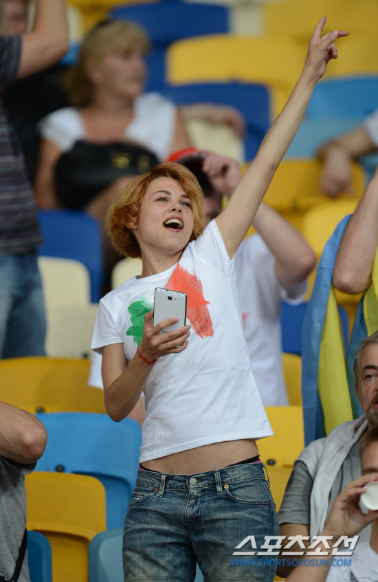 25일(한국시각) 우크라이나 키예프 올림픽스타디움에서 유로 2012 8강전 이탈리아와 잉글랜드의 경기가 열렸다. 경기 전 이탈리아 국기가 그려진 셔츠를 입은 여성팬이 음악에 맞춰 춤을 추고 있다.