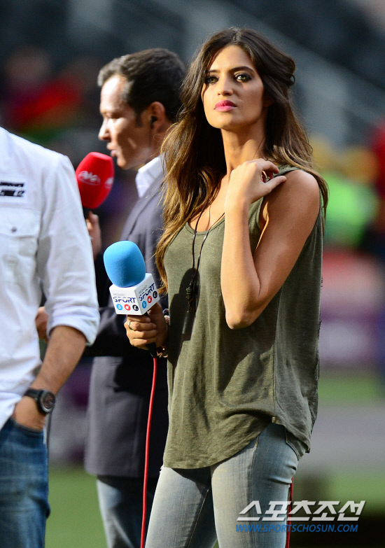 28일(한국시각) 우크라이나 도네츠크 돈바스 아레나에서 유로 2012 스페인과 포르투갈의 4강전이 열릴 예정인 가운데 포르투갈 골키퍼 카시야스의 여자친구이자 TV 스포츠 리포터로 활약하고 있는 사라 까르보네로가 경기 전 그라운드에서 방송 준비를 하고 있다.