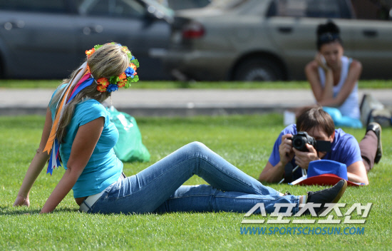 28일(한국시각) 우크라이나 도네츠크 돈바스 아레나에서 유로 2012 스페인과 포르투갈의 4강전이 열린 가운데 양팀의 많은 축구팬들과 도네츠크 시민들이 경기장을 찾았다. 경기장 앞 잔디공원에서 한 커플이 즐거운 오후를 보내고 있다.