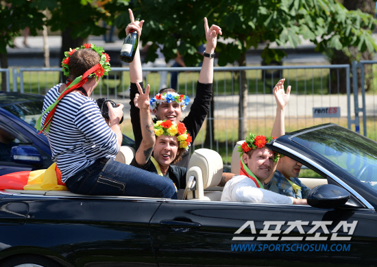 28일(한국시각) 우크라이나 도네츠크 돈바스 아레나에서 유로 2012 스페인과 포르투갈의 4강전이 열린 가운데 양팀의 많은 축구팬들과 도네츠크 시민들이 경기장을 찾았다. 오픈카를 탄 남성들이 머리에 꽃장식을 한 채 즐거운 표정으로 지나가고 있다.