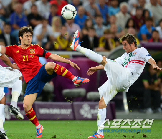 이베리아 반도의 두 팀이 결승 진출을 놓고 한 판 대결을 벌였다. 28일(한국시각) 우크라이나 도네츠크 돈바스 아레나에서 유로 2012 스페인과 포르투갈의 4강전이 열렸다. 스페인 실바와 포르투갈 코엔트랑이 공을 다투며 발을 높이 들고 있다.