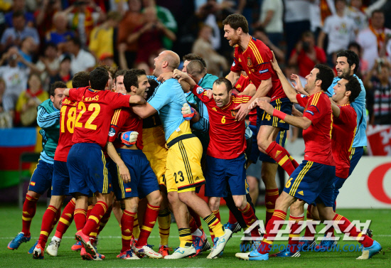 스페인이 포르투갈을 승부차기 끝에 4-2로 누르고 결스에 진출했다. 28일(한국시각) 우크라이나 도네츠크 돈바스 아레나에서 유로 2012 스페인과 포르투갈의 4강전이 열렸다. 스페인이 마지막 키커 파브레가스가 골을 성공시킨 후 선수들이 얼싸안으며 환호하고 있다.