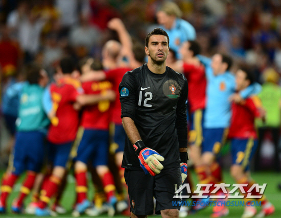 스페인이 포르투갈을 승부차기 끝에 4-2로 누르고 결스에 진출했다. 28일(한국시각) 우크라이나 도네츠크 돈바스 아레나에서 유로 2012 스페인과 포르투갈의 4강전이 열렸다. 스페인이 마지막 키커 파브레가스가 골을 성공시킨 후 선수들이 얼싸안으며 환호하는 가운데 포르투갈 파트리시우 골키퍼가 허탈한 표정으로 걸어오고 있다.