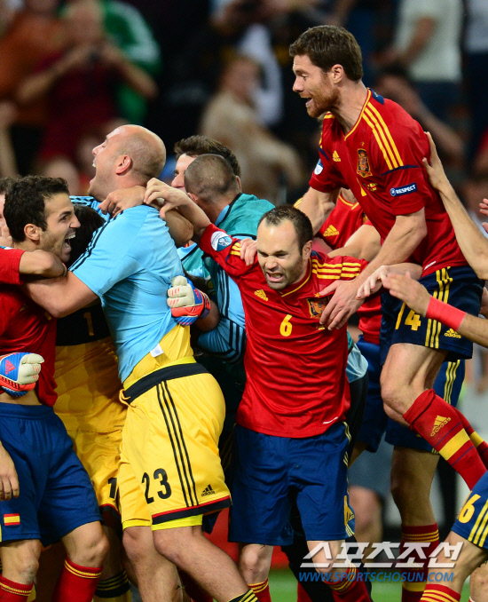 스페인이 포르투갈을 승부차기 끝에 4-2로 누르고 결스에 진출했다. 28일(한국시각) 우크라이나 도네츠크 돈바스 아레나에서 유로 2012 스페인과 포르투갈의 4강전이 열렸다. 스페인이 마지막 키커 파브레가스가 골을 성공시킨 후 선수들이 얼싸안으며 환호하고 있다.