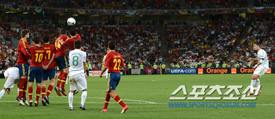 이베리아 반도의 두 팀이 결승 진출을 놓고 한 판 대결을 벌였다. 28일(한국시각) 우크라이나 도네츠크 돈바스 아레나에서 유로 2012 스페인과 포르투갈의 4강전이 열렸다. 호날두의 프리킥이 수비벽 위를 넘어가고 있다.
