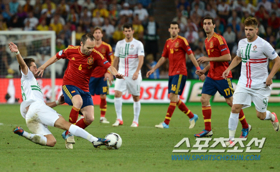이베리아 반도의 두 팀이 결승 진출을 놓고 한 판 대결을 벌였다. 28일(한국시각) 우크라이나 도네츠크 돈바스 아레나에서 유로 2012 스페인과 포르투갈의 4강전이 열렸다. 포르투갈 무티뉴가 스페인 이니에스타의 드리블을 태클로 저지하고 있다.