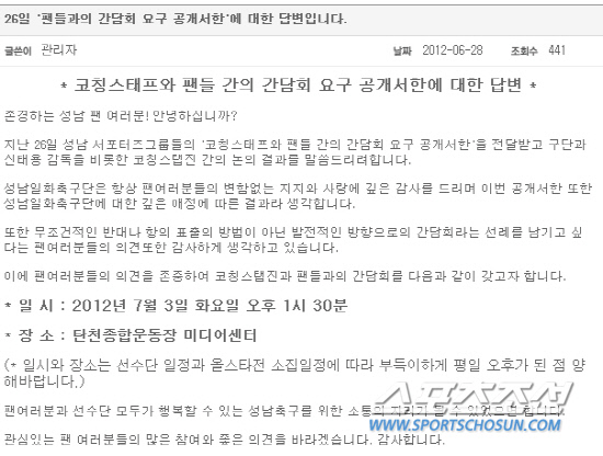 지난 26일 성남 서포터즈그룹들의 '코칭스태프와 팬들 간의 간담회 요구 공개서한'을 전달받고 구단과 신태용 감독을 비롯한 코칭스탭진 간의 논의 결과를 말씀드리려합니다.