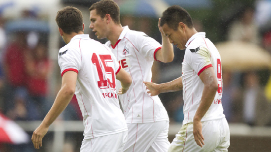 ◇정대세(오른쪽)가 30일(한국시각) FC페슈와의 연습경기에서 해트트릭을 작성했다. 득점 후 팀 동료들의 축하를 받고 있는 정대세. 사진출처=FC쾰른 구단 홈페이지