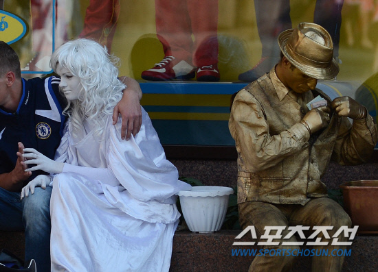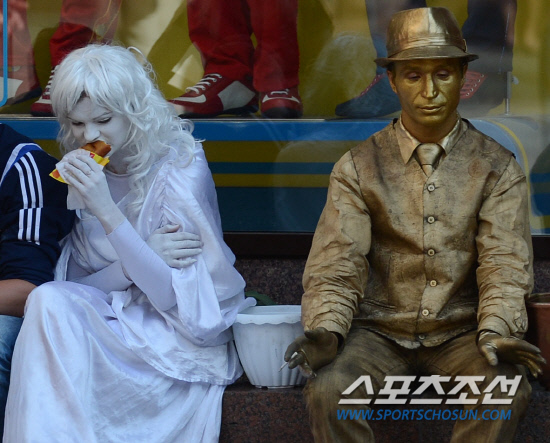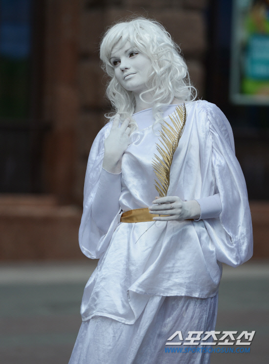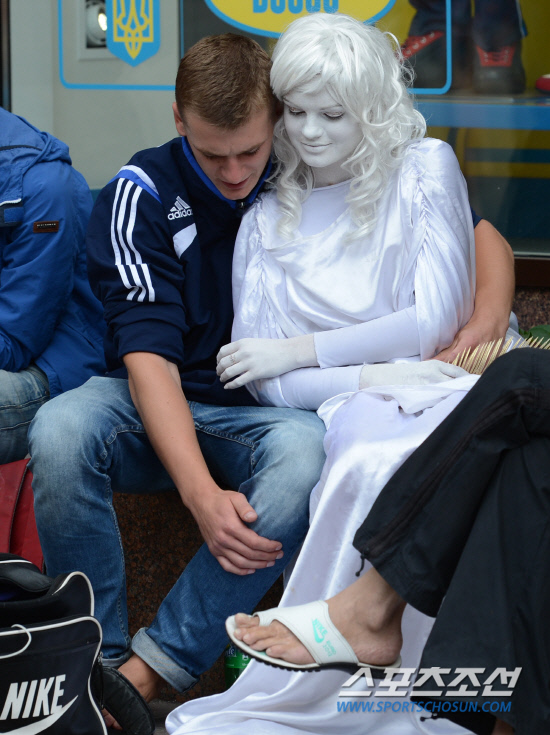 유로 2012가 스페인과 이탈리아의 결승전만을 남겨둔 가운데 개최국 우크라이나 키예프의 시민과 축구팬은 주말을 맞아 축제 분위기를 즐기고 있었다. 1일(한국시각) 세계 시민이 모여든 키예프의 중심가 크리샤틱 거리는 다채로운 공연이 펼쳐지며 사람들의 눈을 즐겁게 했다. 거리 한쪽에서는 마네킹으로 분장한 남녀 공연팀이 사람이 아닌 '진짜 마네킹' 같은 모습으로 시선을 사로잡았다. 그 중 가장 눈길을 끈 것은 비너스처럼 신비로운 자태를 뽐낸 미녀 예술가였다. 키예프(우크라이나)=정재근 기자 cjg@sportschosun.com