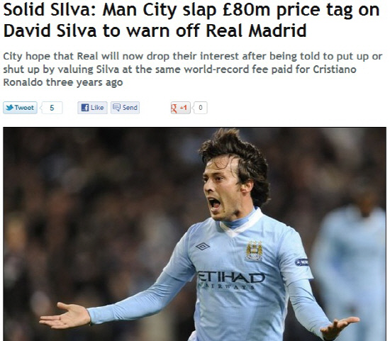 1일(한국시각) 영국 일간지 데일리미러는 맨시티가 다비드 실바의 몸값으로 8000만파운드(약 1431억원)를 설정했다고 보도했다. 8000만파운드는 3년전 크리스티아누 호날두가 세웠던 세계 이적료 신기록과 같은 금액이다.