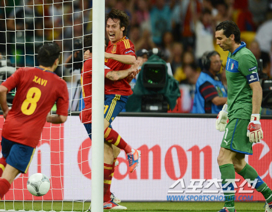 스페인과 이탈리아가 앙리들로네컵을 차지하기 위한 최후의 승부를 벌였다. 2일(한국시각) 우크라이나 키예프 올림픽스타디움에서 유로 2012 스페인과 이탈리아의 결승전이 열렸다. 전반 스페인의 실바가 골을 성공시킨 후 파브레가스와 함께 기뻐하고 있다.