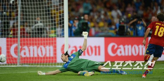 스페인과 이탈리아가 앙리들로네컵을 차지하기 위한 최후의 승부를 벌였다. 2일(한국시각) 우크라이나 키예프 올림픽스타디움에서 유로 2012 스페인과 이탈리아의 결승전이 열렸다. 전반 이탈리아 부폰 골키퍼에 스페인 호르디 알바에게 두 번째 골을 허용하고 있다.