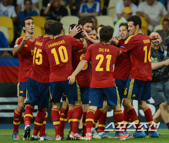 스페인과 이탈리아가 앙리들로네컵을 차지하기 위한 최후의 승부를 벌였다. 2일(한국시각) 우크라이나 키예프 올림픽스타디움에서 유로 2012 스페인과 이탈리아의 결승전이 열렸다. 전반 스페인 호르디 알바가 두 번째 골을 넣고 동료들과 함께 기뻐하고 있다.