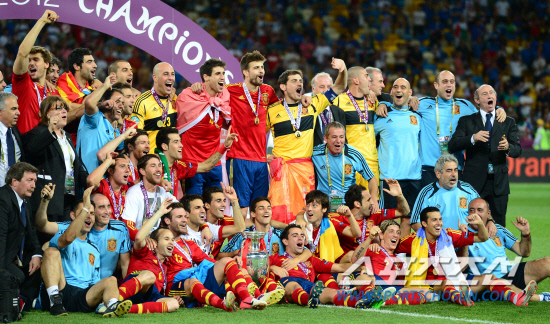 스페인이 이탈리아를 4-0으로 꺾고 앙리들로네컵을 들어올렸다. 2일(한국시각) 우크라이나 키예프 올림픽스타디움에서 열린 유로 2012 결승전에서 스페인은 이탈리아를 로 꺾고 대망의 우승컵을 차지했다. 스페인 선수들이 우승 기념촬영을 하며 환호하고 있다.