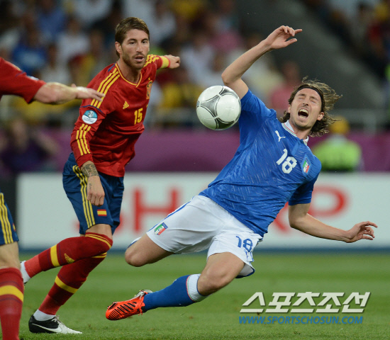 스페인이 이탈리아를 4-0으로 꺾고 앙리들로네컵을 들어올렸다. 2일(한국시각) 우크라이나 키예프 올림픽스타디움에서 열린 유로 2012 결승전에서 스페인은 이탈리아를 로 꺾고 대망의 우승컵을 차지했다. 이탈리아 몬톨리보가 스페인 라모스와 공을 다투다 넘어지고 있다.