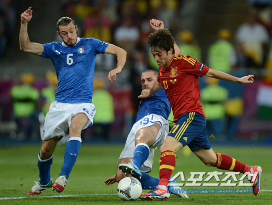 스페인이 이탈리아를 4-0으로 꺾고 앙리들로네컵을 들어올렸다. 2일(한국시각) 우크라이나 키예프 올림픽스타디움에서 열린 유로 2012 결승전에서 스페인은 이탈리아를 로 꺾고 대망의 우승컵을 차지했다. 스페인 실바가 이탈리아 문전에서 돌파를 시도하고 있다.