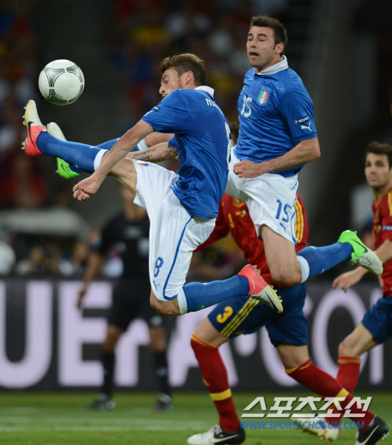 스페인이 이탈리아를 4-0으로 꺾고 앙리들로네컵을 들어올렸다. 2일(한국시각) 우크라이나 키예프 올림픽스타디움에서 열린 유로 2012 결승전에서 스페인은 이탈리아를 로 꺾고 대망의 우승컵을 차지했다. 이탈리아 마르키시오가 점프해 공을 막고 있다.