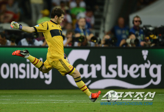 스페인이 이탈리아를 4-0으로 꺾고 앙리들로네컵을 들어올렸다. 2일(한국시각) 우크라이나 키예프 올림픽스타디움에서 열린 유로 2012 결승전에서 스페인은 이탈리아를 로 꺾고 대망의 우승컵을 차지했다. 스페인 카시야스가 킥을 하고 있다.