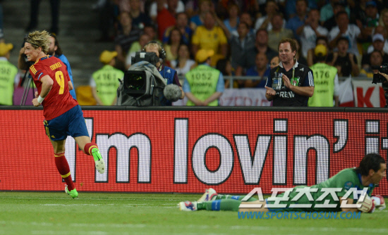 스페인이 이탈리아를 4-0으로 꺾고 앙리들로네컵을 들어올렸다. 2일(한국시각) 우크라이나 키예프 올림픽스타디움에서 열린 유로 2012 결승전에서 스페인은 이탈리아를 로 꺾고 대망의 우승컵을 차지했다. 교체되어 들어온 스페인 토레스가 이탈리아 부폰을 제치고 팀의 세번 째 골을 넣은 후 달려가고 있다.