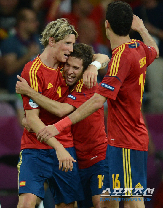 스페인이 이탈리아를 4-0으로 꺾고 앙리들로네컵을 들어올렸다. 2일(한국시각) 우크라이나 키예프 올림픽스타디움에서 열린 유로 2012 결승전에서 스페인은 이탈리아를 로 꺾고 대망의 우승컵을 차지했다. 교체되어 들어온 스페인 토레스가 팀의 세번 째 골을 넣은 후 호르디 알바와 포옹을 하고 있다.