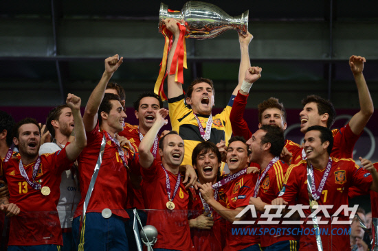 스페인이 이탈리아를 4-0으로 꺾고 앙리들로네컵을 들어올렸다. 2일(한국시각) 우크라이나 키예프 올림픽스타디움에서 열린 유로 2012 결승전에서 스페인은 이탈리아를 로 꺾고 대망의 우승컵을 차지했다. 스페인 카시야스가 앙리들로네컵을 들자 모든 선수들이 환호하고 있다.