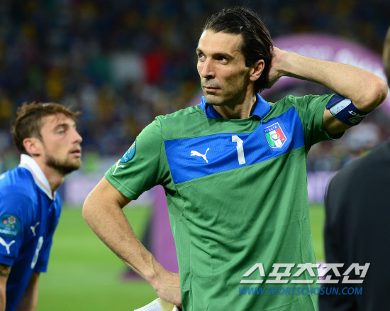 스페인이 이탈리아를 4-0으로 꺾고 앙리들로네컵을 들어올렸다. 2일(한국시각) 우크라이나 키예프 올림픽스타디움에서 열린 유로 2012 결승전에서 스페인은 이탈리아를 로 꺾고 대망의 우승컵을 차지했다. 시상식에서 이탈리아 부폰이 허탈한 마음을 억누르고 있다.