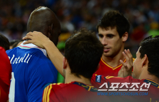 스페인이 이탈리아를 4-0으로 꺾고 앙리들로네컵을 들어올렸다. 2일(한국시각) 우크라이나 키예프 올림픽스타디움에서 열린 유로 2012 결승전에서 스페인은 이탈리아를 로 꺾고 대망의 우승컵을 차지했다. 시상식에서 스페인 선수들이 이탈리아 발로텔리를 위로하고 있다.