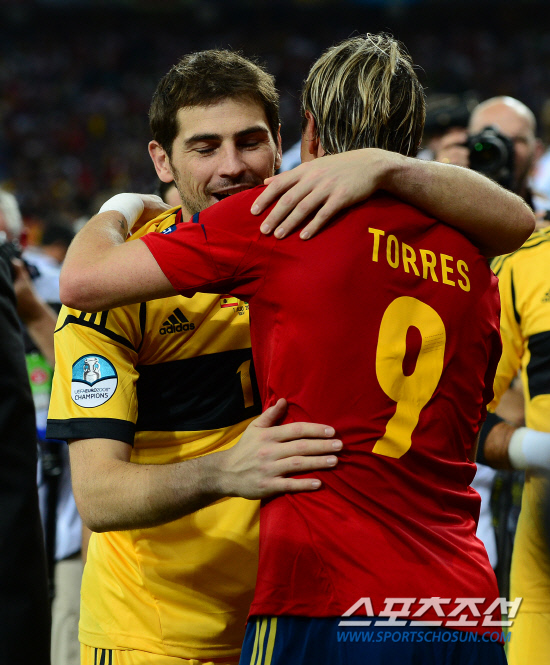 스페인이 이탈리아를 4-0으로 꺾고 앙리들로네컵을 들어올렸다. 2일(한국시각) 우크라이나 키예프 올림픽스타디움에서 열린 유로 2012 결승전에서 스페인은 이탈리아를 로 꺾고 대망의 우승컵을 차지했다. 시상식에서 카시야스와 토레스가 포옹을 하고 있다.