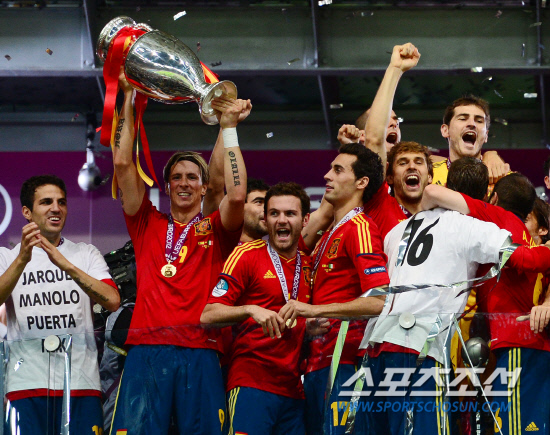 스페인이 이탈리아를 4-0으로 꺾고 앙리들로네컵을 들어올렸다. 2일(한국시각) 우크라이나 키예프 올림픽스타디움에서 열린 유로 2012 결승전에서 스페인은 이탈리아를 로 꺾고 대망의 우승컵을 차지했다. 시상식에서 토레스가 앙리들로네컵을 들고 있다.
