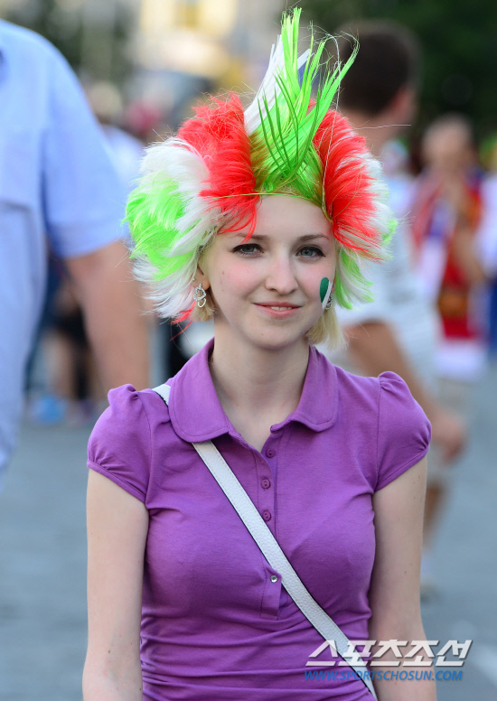 축구팬들이 마지막 축제를 즐기기 위해 한 자리에 모였다. 2일(한국시각) 우크라이나 키예프 올림픽스타디움에서 열리는 유로 2012 스페인과 이탈리아의 결승전을 앞두고 이탈리아를 응원하는 여성팬이 경기장으로 향하고 있다.